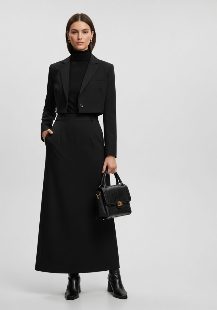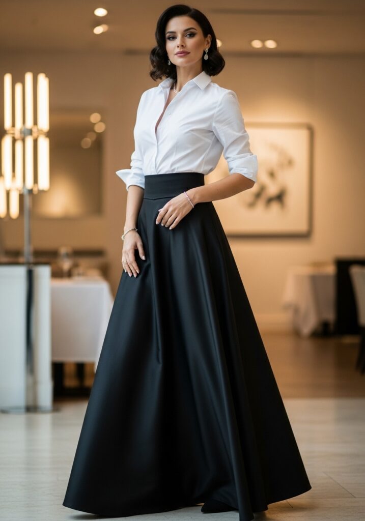 For work, choose a structured black long skirt (perhaps with a high waist or slight A-line) and pair with a tailored blazer or crisp blouse. The classic proportions allow you to look professional and stylish without resorting to pants.