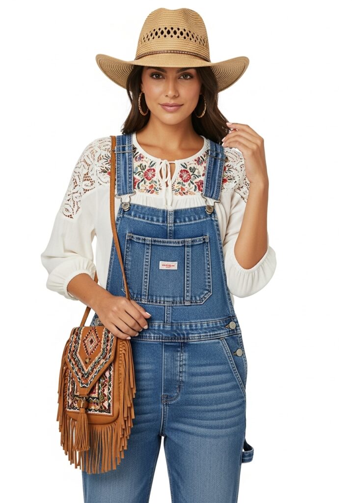 Denim overalls bring in the true country workwear feel, but when styled with a lace peasant blouse you lift it into boho territory. The blouse’s embroidery and soft drape contrast beautifully with the rugged denim, offering comfort and style. Try pairing it with a wide-brim hat and maybe incorporate a piece like the “Classic Cowgirl Hat Straw” or “Embroidered Fringe Crossbody Bag” for finishing touches.