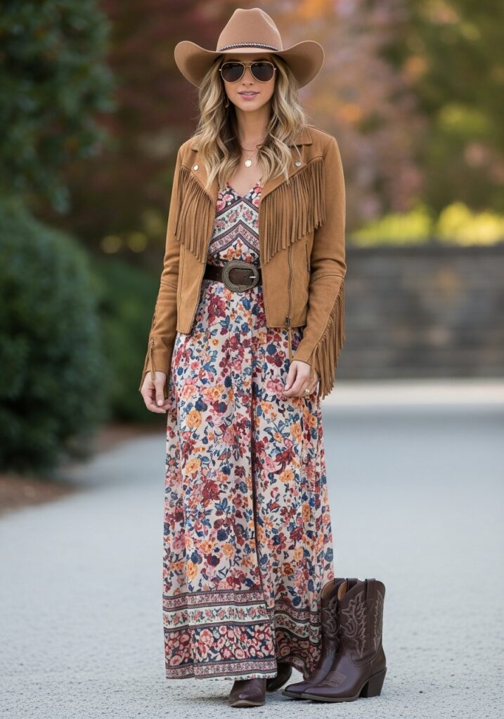 This look combines a flowing maxi floral dress with a suede or faux-suede fringe jacket, offering a perfect blend of bohemian patterns and rustic texture. It’s ideal for spring or fall outings when you want effortless movement and just a touch of edge. For a layered finish you could mix in accessories like the “Vintage Western Style Belt” or the “Cowboy Bootie Mid Heel” to echo both boho and country aesthetics.