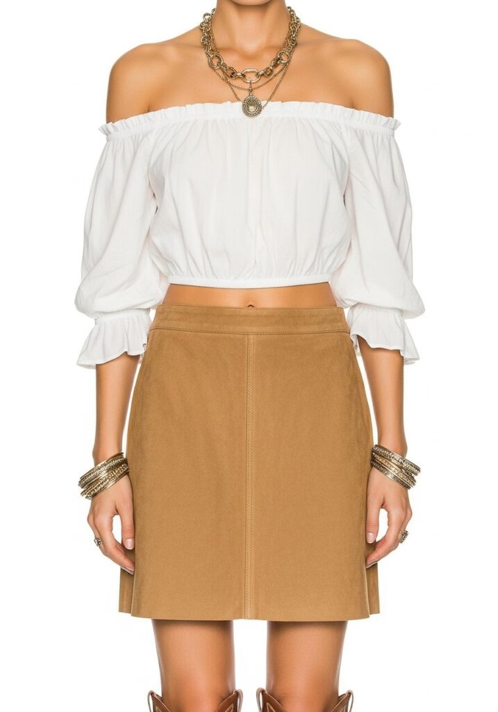 Picture a tan suede mini or midi skirt paired with an off-shoulder cotton top. The suede speaks to the country roots, while the off-shoulder flair adds boho romance. It’s perfect for brunch outings or casual evenings when you want to feel chic but grounded. Accessorize with boots or chunky jewelry to lean further into the dual aesthetic.