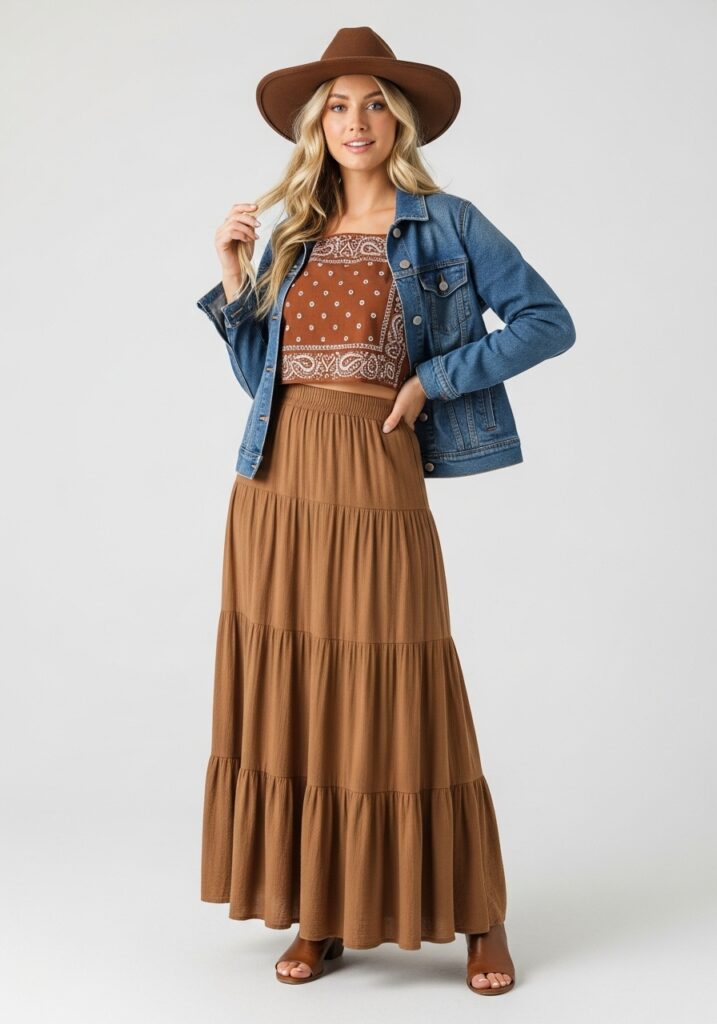 Tiered skirts are inherently bohemian thanks to their flow and volume; choosing one in a neutral earth tone grounds it with a country vibe. Pairing with a bandana-print top links back to western motifs, and you could layer in a denim jacket to complete the look. The result: comfy, stylish, and full of personality.