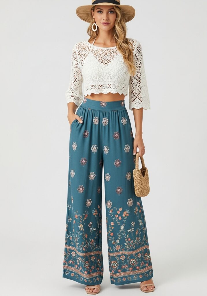 Crochet tops instantly channel that handmade, vintage bohemian feel. Pair one with high-waisted, wide-leg pants for a flattering and relaxed silhouette. The SheIn Women’s Crochet Hollow Out Crop Top is delicate yet stylish, while the Dokotoo Women’s Palazzo Pants High Waisted Loose Trousers provide comfort and flow. This look is ideal for beach days, brunch dates, or casual outings.