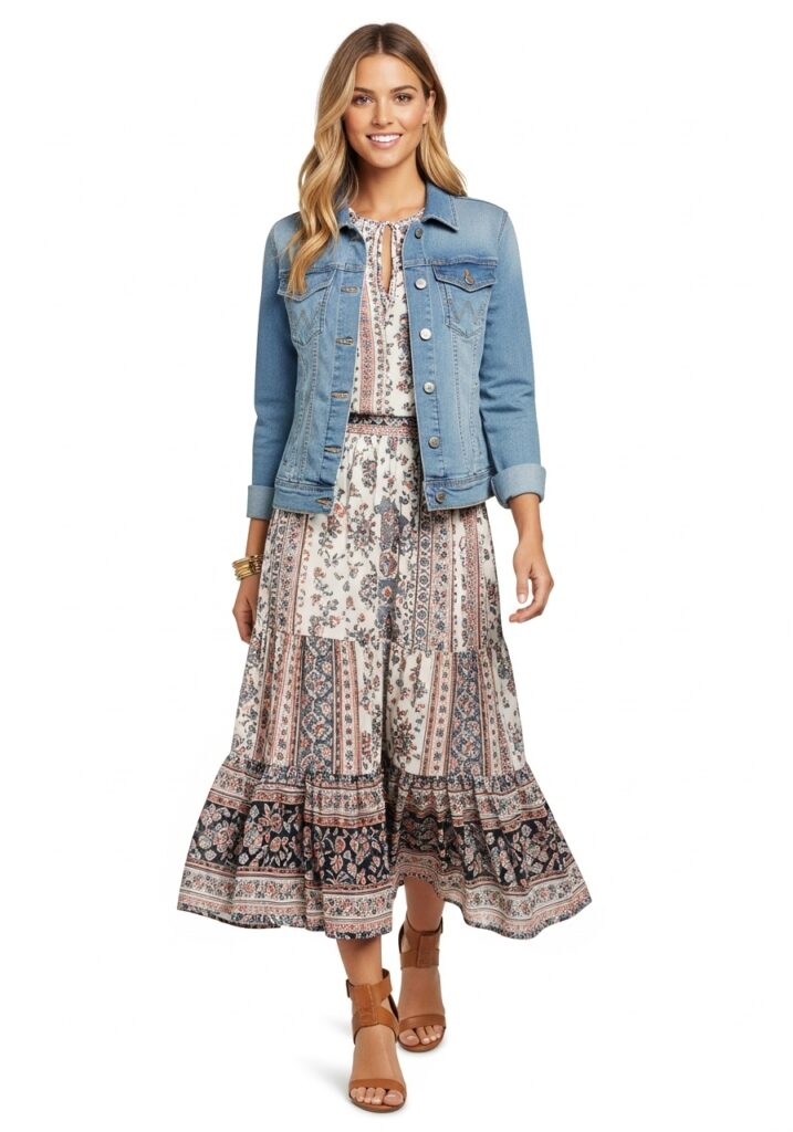 2. Denim Jacket Over a Flowy Midi Skirt