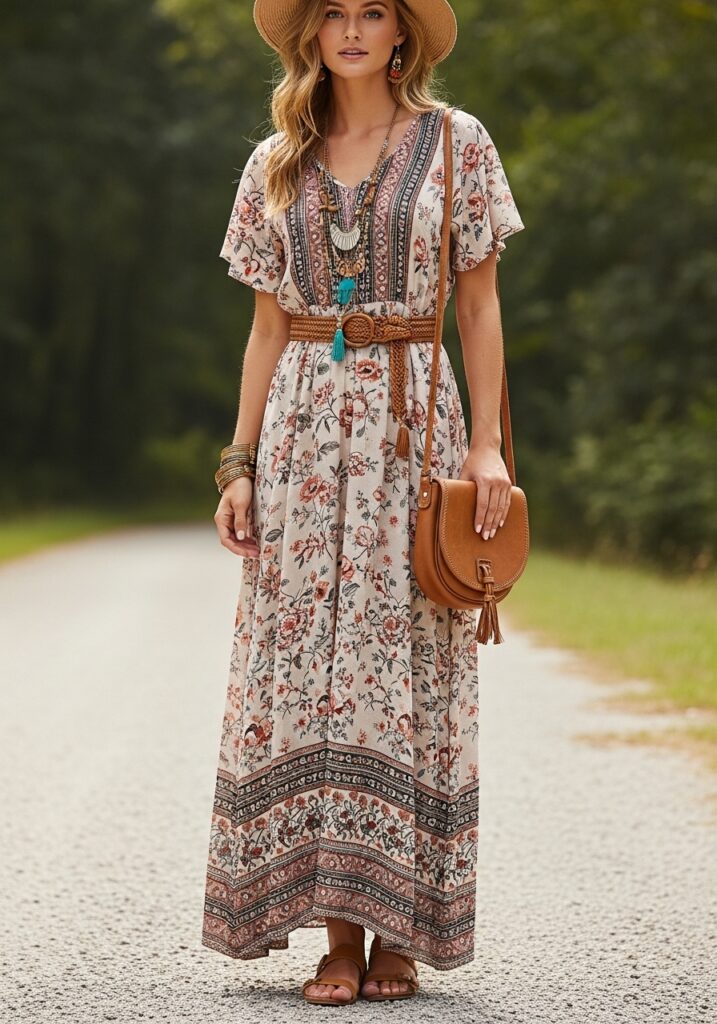 1. Flowy Maxi Dress with Earthy Accessories