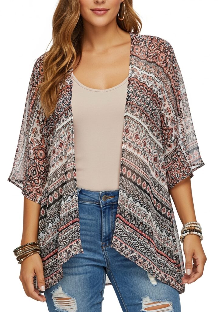 Kimonos bring a touch of elegance to any boho look. Layer a printed kimono over a plain tank and distressed jeans for effortless sophistication. The Ferand Women’s Boho Chiffon Kimono Cardigan offers a soft, airy drape, and the Amazon Essentials Women’s Slim-Fit Tank Top complements it with a clean base. Add some beaded bracelets for a true bohemian finish.