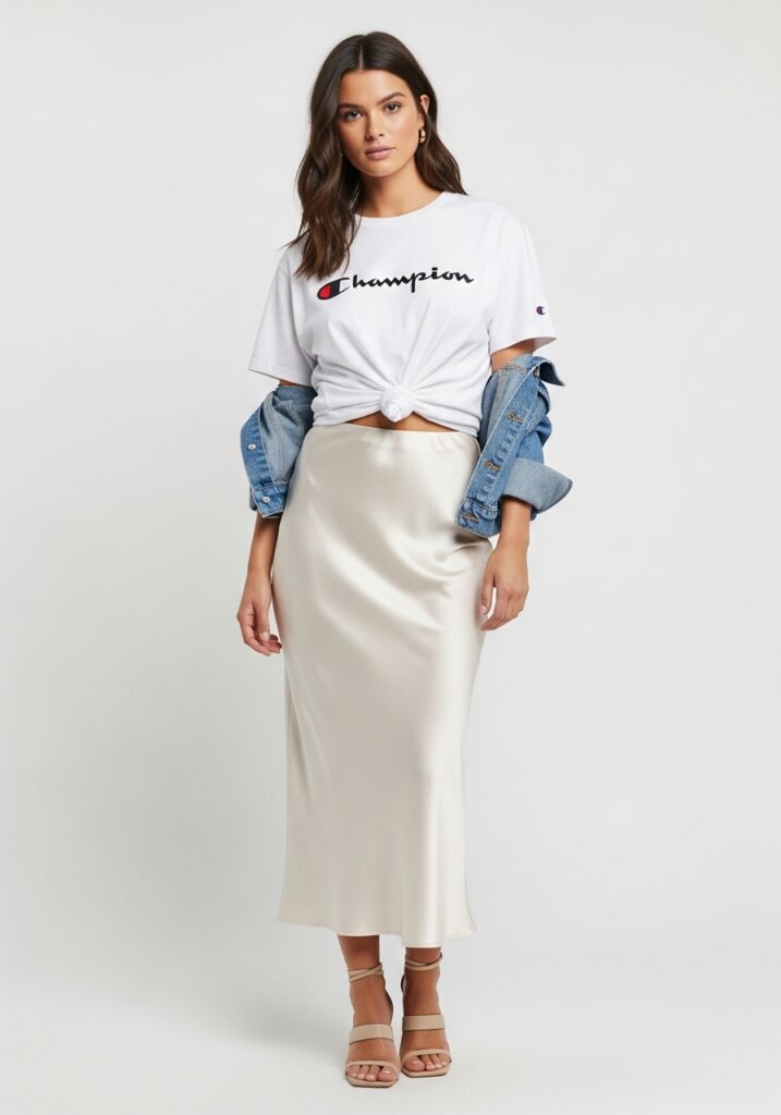For an effortlessly cool vibe, tuck an oversized tee into a sleek satin skirt. The Champion Women’s Boyfriend T-Shirt contrasts perfectly with the MANGOPOP Women’s Satin Long Skirt. This pairing creates a fashionable mix of casual and luxe textures. You can knot the tee for added shape or layer with a cropped denim jacket. It’s a go-to look for evening dinners, museum visits, or coffee shop work sessions — comfortable yet irresistibly elegant.