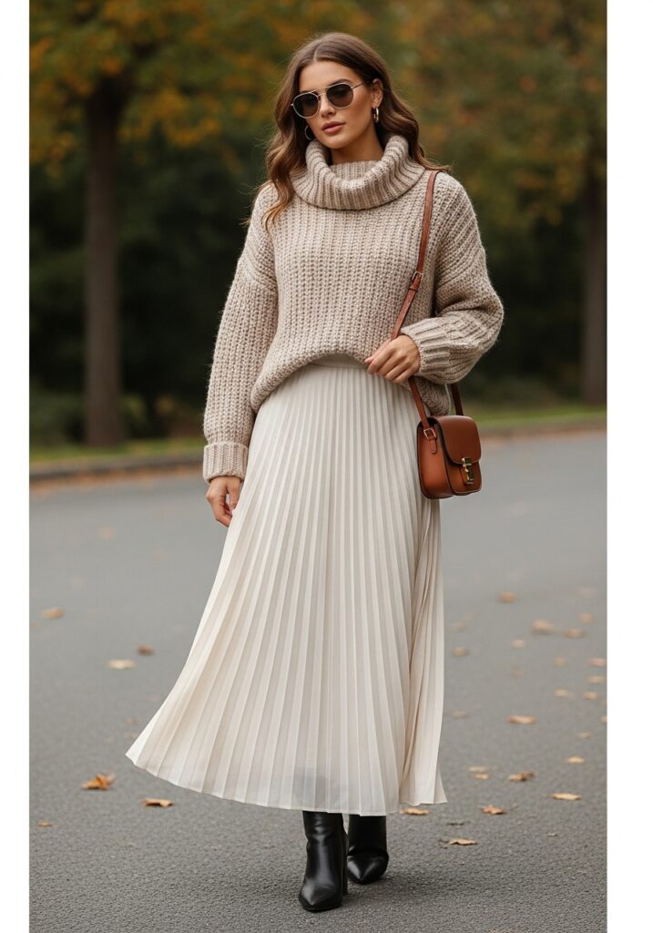 Nothing says cozy chic like pairing a chunky knit with a pleated maxi skirt. This combination flatters all body types while keeping you warm. A soft knit like the ANRABESS Women’s Turtleneck Oversized Sweater adds texture and dimension. Style it with the elegant GRACE KARIN Women’s Pleated A-Line Long Skirt for a graceful yet modern silhouette. Add ankle boots and a crossbody bag for a perfect fall day look.
