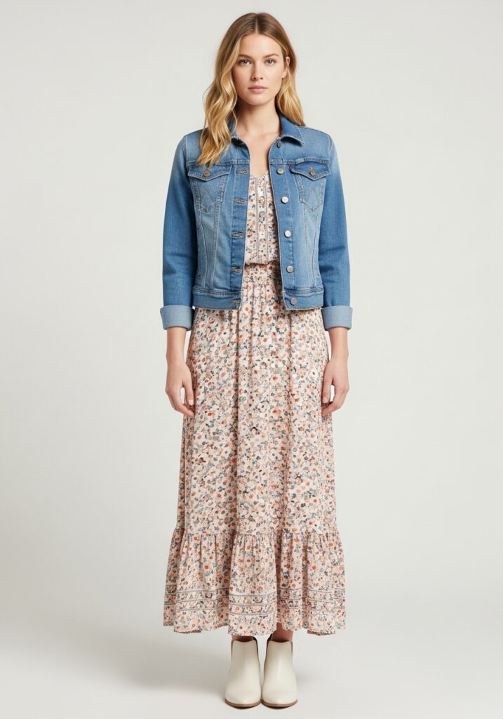 For a youthful, casual vibe, combine a floral maxi skirt with a light denim jacket. The contrast between soft prints and structured denim creates an effortlessly stylish ensemble. Try the Wrangler Authentics Women’s Stretch Denim Jacket layered over the ZESICA Women’s Bohemian Floral Maxi Skirt. Complete with ankle boots or white sneakers for weekend strolls and brunches.