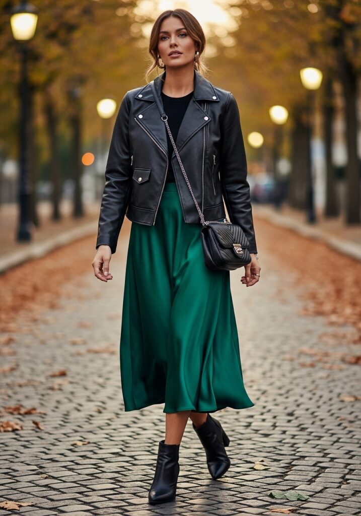 | Leather Jacket + Satin Skirt | Evening Outfits | Satin/Leather Mix | Contrast of textures | Chic & Modern |