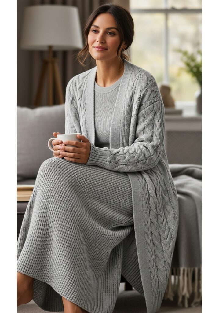For the ultimate cozy vibe, go monochrome with a long cardigan and matching knit skirt. The MEROKEETY Women’s Cable Knit Long Cardigan pairs perfectly with the SHEIN Women’s Elastic Waist Knit Long Skirt. This combo works wonderfully for lounging or casual outings while maintaining an effortlessly put-together appearance.