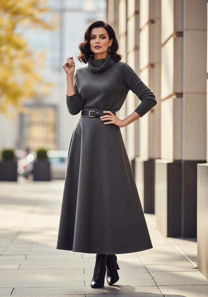 A sleek turtleneck tucked into a wool skirt gives timeless elegance. The Amazon Essentials Women’s Lightweight Turtleneck Sweater matches beautifully with the Grace Karin High Waist Wool Long Skirt. Add a belt to define your waist and heeled boots for a refined, cold-weather-ready look.