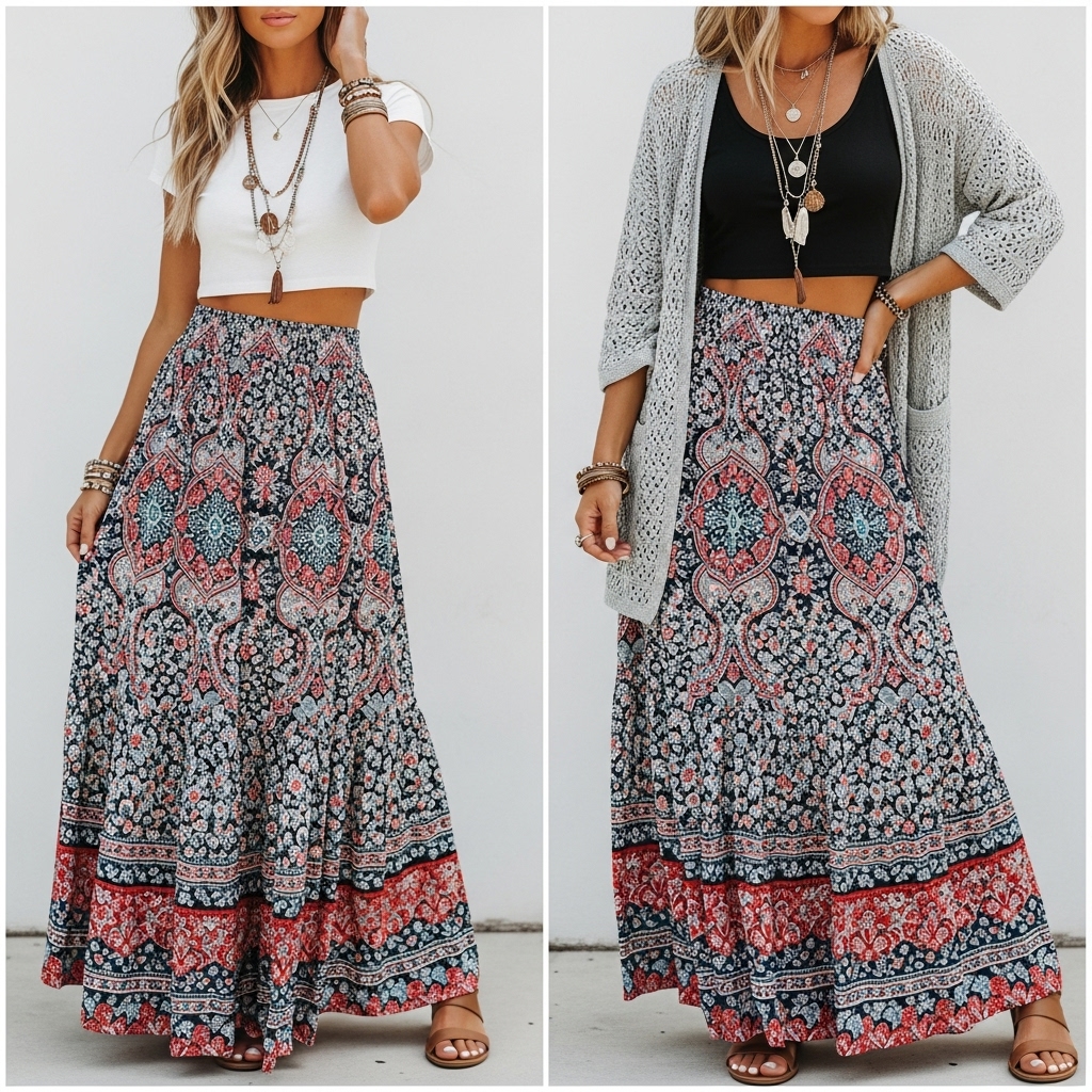 Boho-inspired long skirts bring a carefree yet stylish charm. Pair a printed maxi skirt with a simple crop top and layered jewelry for an effortless summer look. The “ZESICA Women’s Bohemian Floral Printed Maxi Skirt” and “Lock and Love Women’s Maxi Skirt with Elastic Waistband” both offer flowy comfort with vibrant prints that flatter every body shape. These skirts are perfect for beach vacations or casual brunches, and they transition easily into cooler months with a denim jacket or knit cardigan.