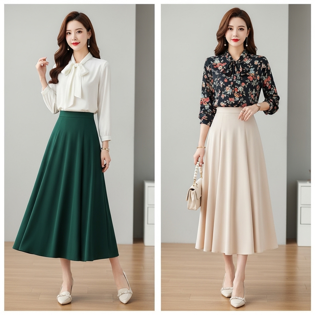 A-line skirts flatter most body types and add a touch of classic femininity. Combine a high-waisted A-line skirt with a tucked-in blouse for an office-ready or semi-formal outfit. The “Luvamia Women’s High Waist A-Line Long Skirt” and “Chuanqi Women’s Pleated High Waist Maxi Skirt” bring both sophistication and ease. You can complete this look with heels or loafers, making it suitable for both work and weekend events.
