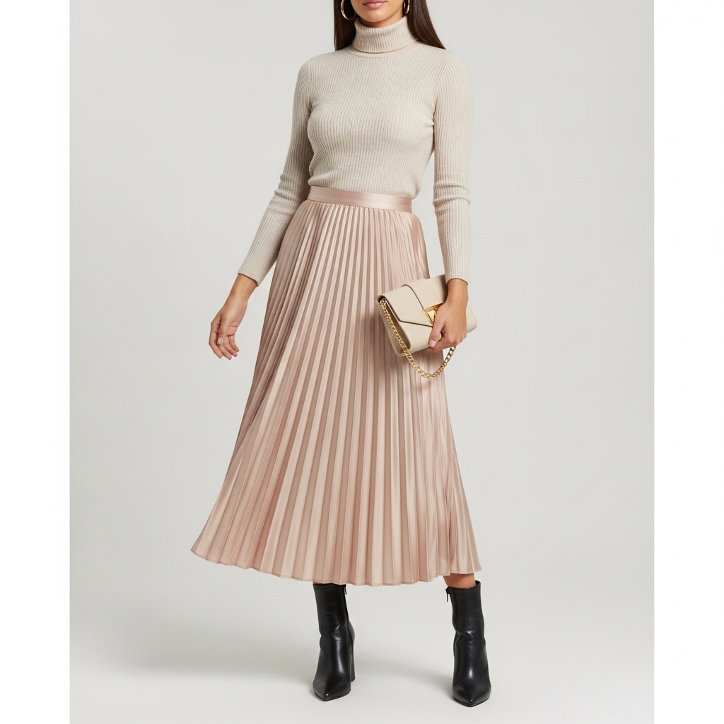For an elegant and polished vibe, pleated satin skirts are a wardrobe staple. Match them with a fitted turtleneck and ankle boots for a chic winter-to-spring look. The “GRACE KARIN Women’s Pleated Satin Midi Skirt” and “Kate Kasin Women’s Shiny Pleated Long Skirt” are stylish options that offer a glossy finish perfect for special occasions. These skirts can elevate your outfit instantly and pair beautifully with minimal gold accessories.