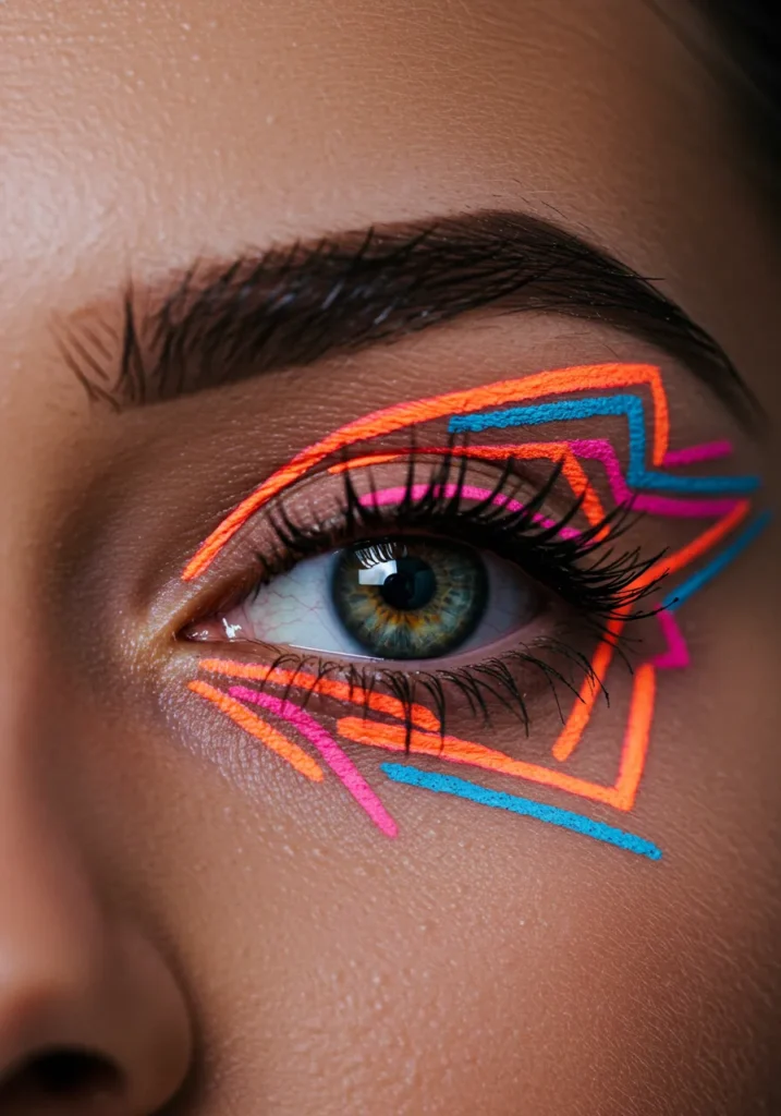 Create geometric designs using neon liners or liquid shadows—think zigzags, hearts, or arrows. This style is for bold makeup lovers who want to make a high-fashion impact. It’s ideal for music festivals or themed parties.