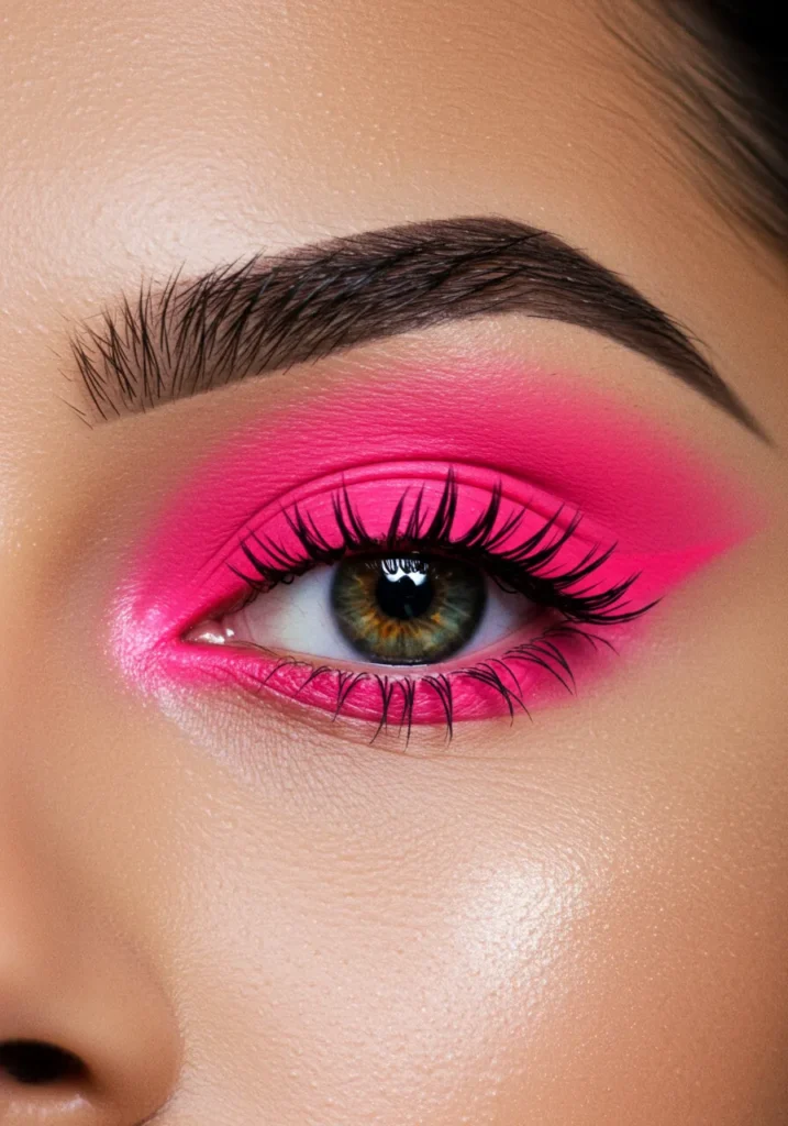 This bold yet clean style uses a hot pink neon shadow to create a precise crease that defines the eyelid. Add a white or silver shimmer on the lid for contrast. The key benefit of this look is its ability to lift and brighten the eyes, making it a great choice for parties or date nights. Pair it with a nude lip and let your eyes do the talking. It also complements fancy sandals and heels beautifully for an all-glam outfit.