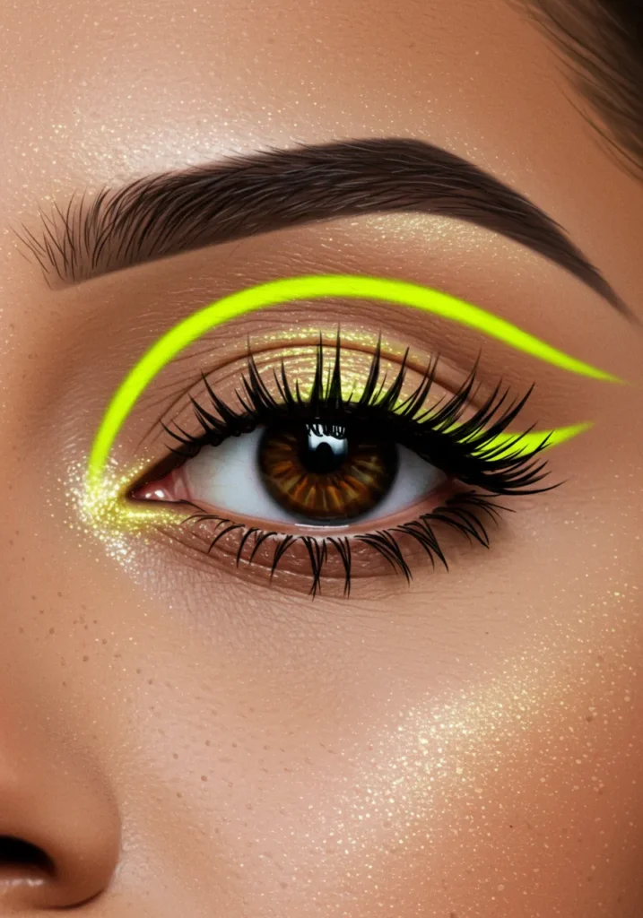 Apply neon yellow to the center of your eyelids and surround it with darker shadows for a glowing halo effect. This makes your eyes look bigger and gives them a radiant shine. It’s perfect for night events and pairs well with sleek hairstyles like short layered cuts.