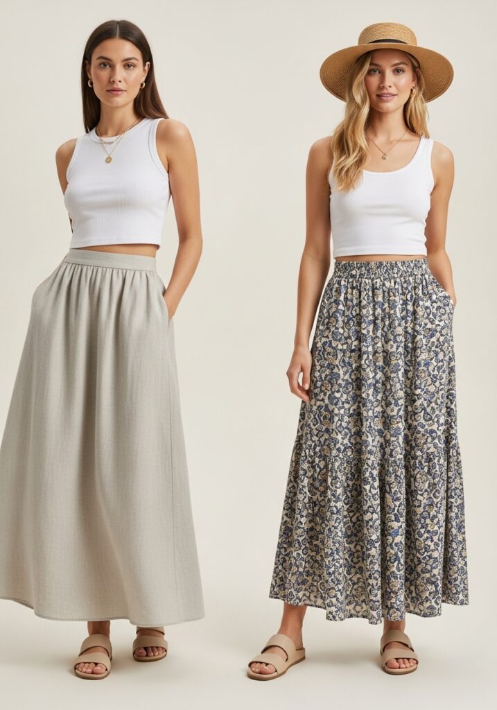 A linen A-line long skirt paired with a fitted cropped tank is dreamy for summer heat—lightweight fabric, room for airflow, and feminine shape without feeling fussy. The silhouette elongates the body and keeps things casual but chic. You could even pair it with a skirt like the “Women’s Maxi A-Line Long Skirt Casual 2025 Elastic High Waist Flowy Skirts with Pockets” on Amazon (affiliate code: hassansaleem-20) for a reliable base. Then add a crisp white tank and slide sandals for an easy-going daytime look. Because long skirts are so versatile, you might also drop in a piece like the “Women’s Boho Maxi Skirt Summer Swing Tiered A-Line Elastic High Waist” (also Amazon, hassansaleem-20) to vary your wardrobe. According to styling guides, maxi skirts are “timeless, endlessly versatile, and somehow always feel current no matter what’s trending” The Stripe.