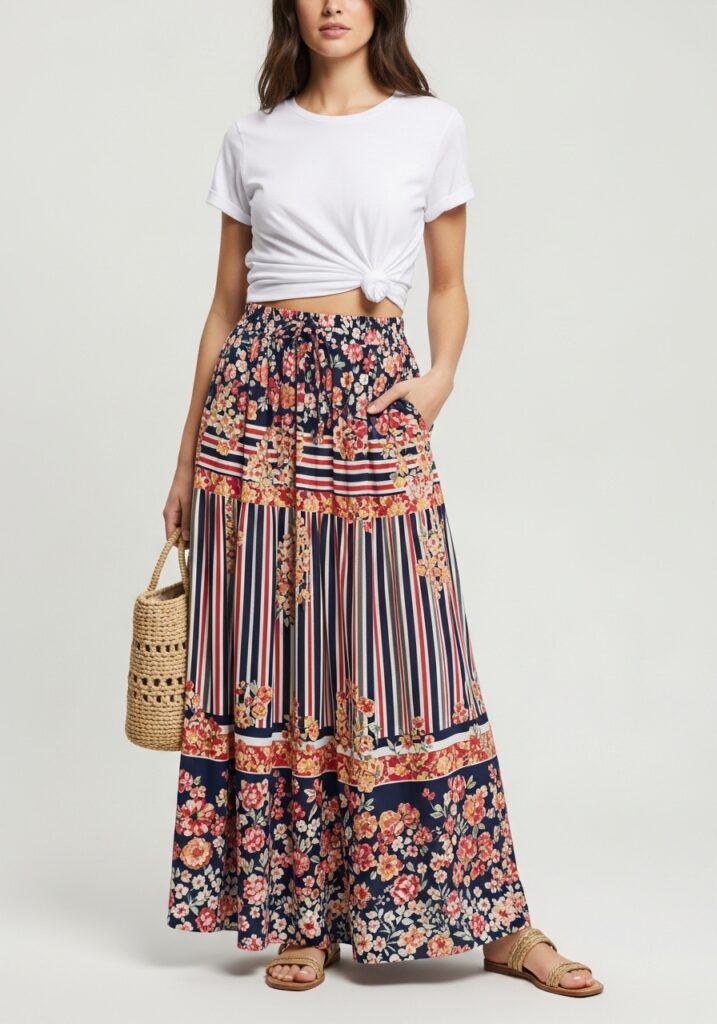 Choose a printed long skirt—florals, stripes, or a fun abstract—and pair it with a plain tee tucked in at the waist. The print becomes the statement piece, while the tee keeps things grounded. This combo harnesses the outfit power of a skirt that “can either be the star of the show… or play a supporting role to a really great top” The Stripe. For example, one of the Amazon options above works well with a crisp white tee and minimal accessories. Swap in simple flat sandals and maybe a woven bag to keep the vibe easy and daytime-ready.