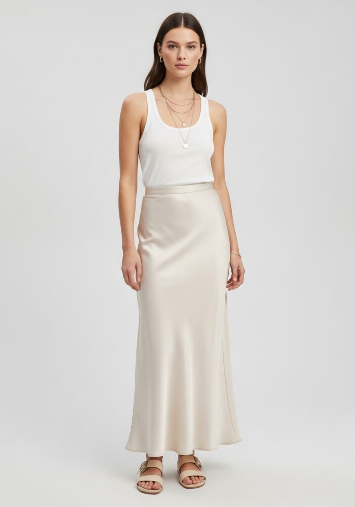 A slip style long skirt (lightweight, slightly shiny, ankle length) paired with a fitted tank top delivers a bit of elegance without sacrificing comfort. In fact, one style commentary notes that the slip skirt “stands out as a stylish and comfortable alternative to jeans and shorts” for warm days. Vogue Wear with minimalist sandals and layered thin necklaces.