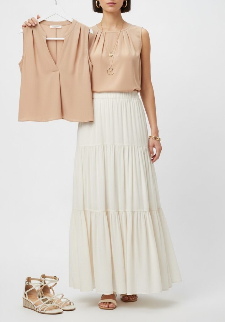 A pleated long skirt adds texture and movement. Pair it with a slightly oversized slouchy tee or tank—either half-tucked or tucked fully—to contrast the refined skirt. Predictably, styling guides for maxi skirts mention mixing volume and structure: “If the skirt has full, A-line or relaxed silhouette, stick to a more fitted top” and vice-versa. Woman & Home A casual flat sandal or even a minimal sneaker keeps it grounded.