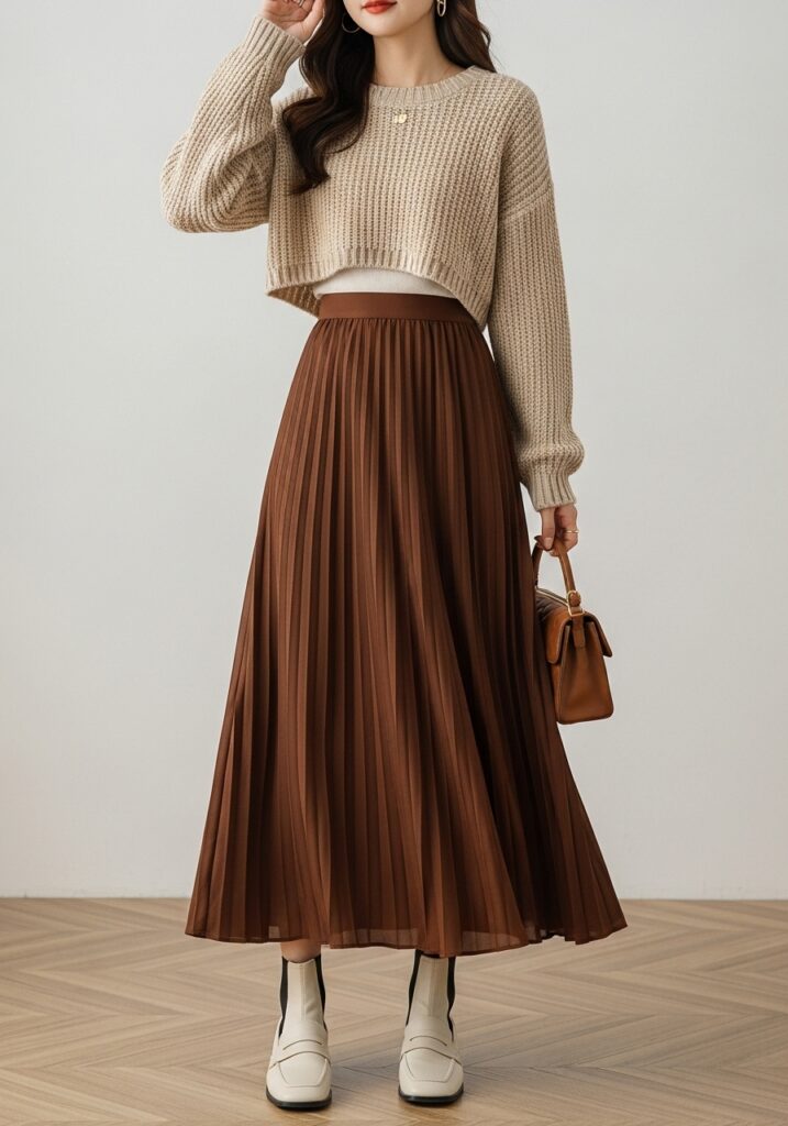 An A-line maxi skirt gives you graceful length, and when paired with a cropped knit sweater you get that balance of ease and polish popular in Korean styling. For example, the “Women Long Skirt Brown Korean High Waist Pleated Skirts” (affiliate link: Women Long Skirt Brown Korean High Waist Pleated Skirts) offers a high-waist pleated design that flows beautifully. With this outfit, let the skirt be the star — go lightweight on the top and accessories, maybe slip in ankle boots or loafers for an autumn-friendly finish.