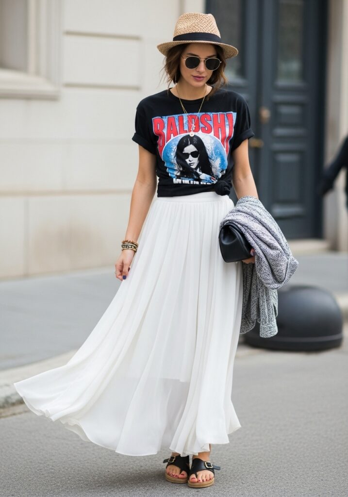 Graphic Tee With Flowing SkirtLight cotton or chiffonSneakers or flat sandals