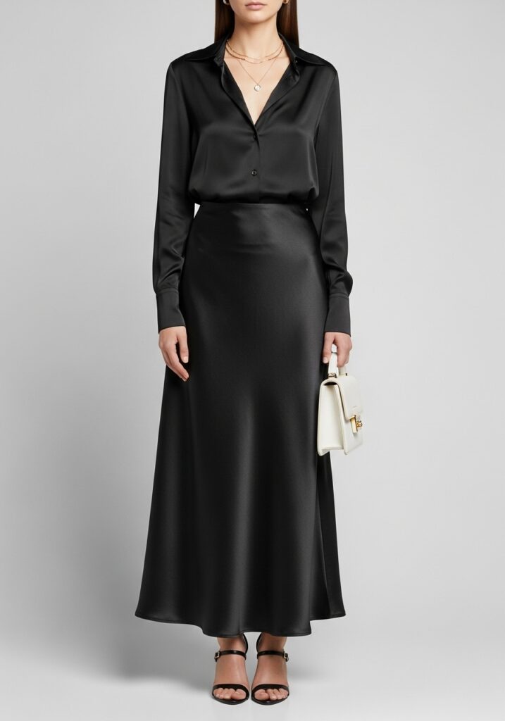 Monochrome Satin SetSatin or silk blendMinimal heels or mules