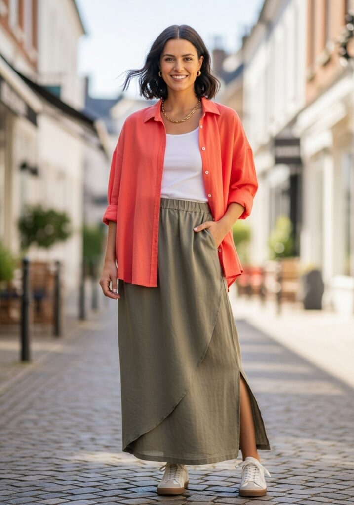 Oversized Shirt Over Long SkirtLinen or cotton blendLoafers or ankle boots