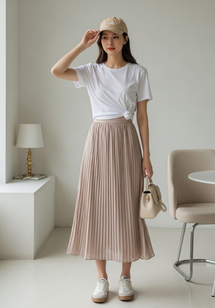 Think of a softly pleated midi skirt paired with a simple tucked white tee — the kind of look you’ll spot in Seoul cafés and campuses. The pleats add movement and elegance while the tee keeps it relaxed. You could anchor this look with a long pleated skirt like the “Elegant Women’s Long Skirt 2024 Korean Satin Skirts Office Lady Elastic Waist Solid A-Line Skirt” (affiliate link: Elegant Women’s Long Skirt 2024 Korean Satin Skirts Office Lady Elastic Waist Solid A-Line Skirt) or try a more casual flowy option. Pair it with sneakers or low heels, add subtle accessories and you’ve got a look that’s stylish without feeling overdone.