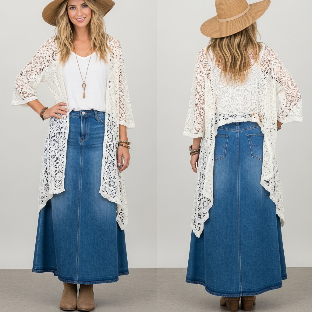 Channel free-spirited energy by combining your long denim skirt with flowy layers, like a crochet top or kimono. The Dokotoo Women’s Lace Crochet Kimono Cardigan adds a breezy boho texture, while the Amazon Essentials Women’s Long Denim Skirt offers a flattering base. This outfit shines at music festivals or weekend getaways and pairs beautifully with ankle boots or flat sandals for a relaxed, artsy appeal.