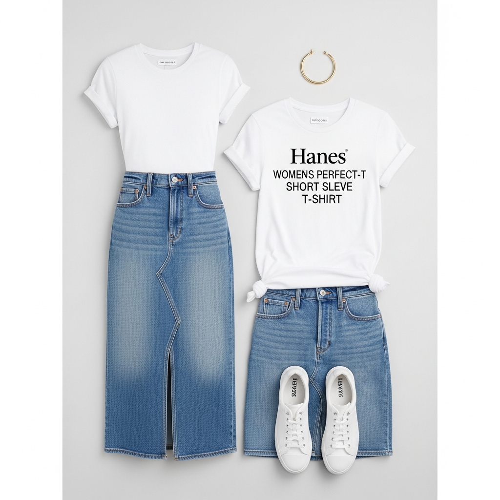 | Classic White Tee Combo | Everyday wear | Simplicity, minimalism | Hanes Women’s Perfect-T Short Sleeve T-shirt |
