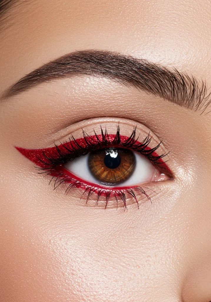 Skip full eyeshadow and go for a pop of red liner. Whether you prefer a liquid cherry red wing or a smoked-out pencil along the lash line, this look delivers impact with minimal effort. It’s a fantastic way to experiment with color if you’re new to red eye makeup. Combine it with cat eye makeup styles for added edge.