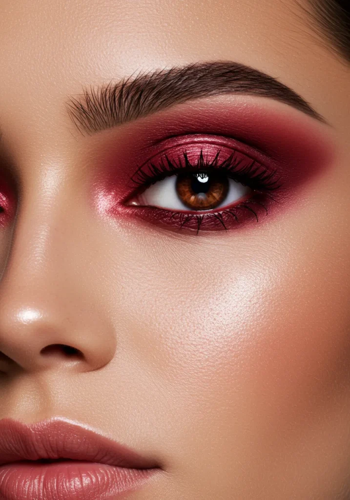 The red smokey eye adds intensity without going overboard. Start with a matte brick red base on the lid and blend outwards with a deep burgundy or chocolate brown for depth. Highlight the inner corners with a soft shimmer to soften the look. This dramatic style is ideal for evening events and pairs beautifully with nude lips. Great for enhancing brown eyes, this look flatters nearly every skin tone.