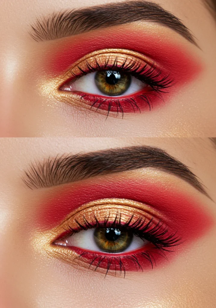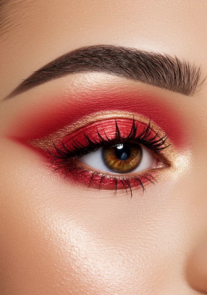 Combine rich red tones with golden shimmer for a regal, festive look. This fusion works especially well during holidays or special events. Layer red on the outer lid and blend gold into the inner corner and brow bone. The warmth of both colors creates a flattering gradient and pairs perfectly with burgundy nail designs or a gold-toned outfit.