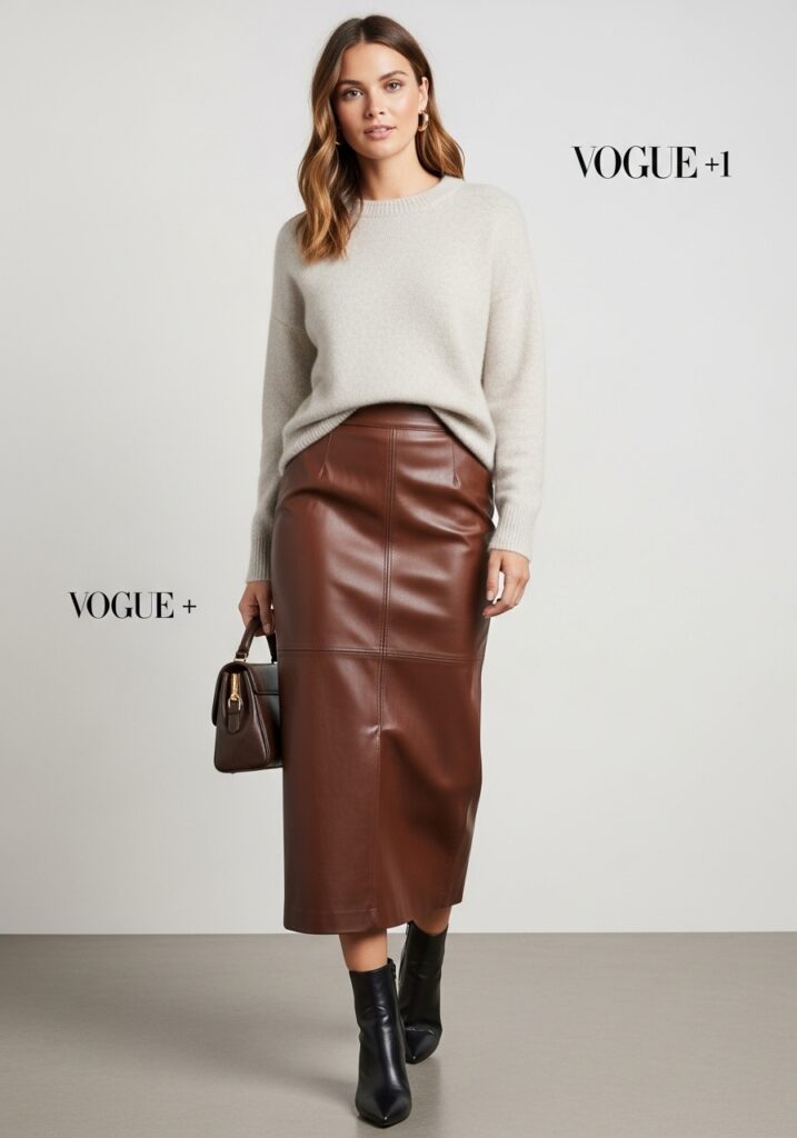 Giving the classic long pencil skirt a leather or faux leather finish brings edge and drama to your outfit while maintaining the polished silhouette. Fashion editors highlight leather pencil skirts in rich tones as key pieces this season. Vogue+1 Pair a brown leather pencil skirt with a tucked-in light cashmere sweater and ankle boots. The “Women’s Long Midi Pencil Skirt – High Waisted Bodycon” from Amazon could be a match if available in faux leather finish; link above. For a softer underlayer, the “Women’s Knit Midi Skirt High Waisted Long Skirt with Slit” works with an oversize blouse instead. The result: refined but bold.