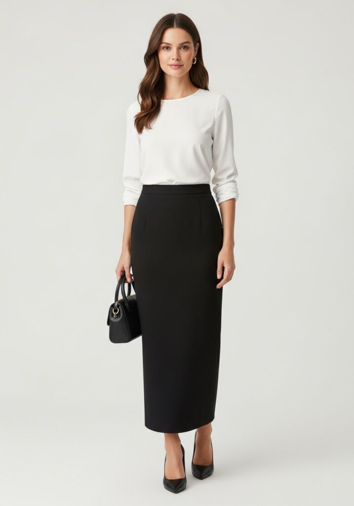 For a sleek, modern look, pair a neutral-toned long pencil skirt (say black, charcoal, or taupe) with a matching or slightly lighter top. This creates a streamlined vertical silhouette that elongates the figure. For example, tuck in a crisp [INSERT LINK 1] white cotton blouse and add pointed-toe pumps. To complement this outfit you might consider a long pencil skirt from Amazon such as “Women’s Long Midi Pencil Skirt – High Waisted Bodycon” (affiliate link: Women’s Long Midi Pencil Skirt-High Waisted Bodycon) and another like the “Women’s Basic Stretch Pencil Skirt – Regular & Plus Size” (affiliate link: Women’s Basic Stretch Pencil Skirt). A clean monochrome palette makes that skirt look intentional, elevated and office-ready.