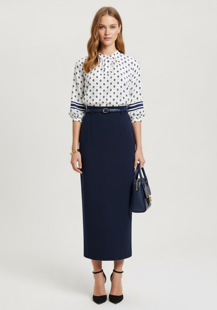 If your skirt is a solid color, you can elevate it by introducing a patterned or printed top—think subtle florals, stripes or geometric prints. The long pencil skirt grounds the look, while the top adds personality. For instance, a navy pencil skirt with a white blouse bearing navy polka-dots, tucked in, and a navy belt. To complement: use the basic stretch pencil skirt link and the knit midi skirt link above for layered texture. This styling brings polish with a touch of fun.