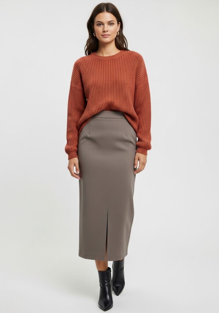 Combine a long pencil skirt in a structured fabric with a soft knit top or sweater for a balanced look that’s comfortable yet refined. For instance, a ribbed terracotta sweater worn untucked with a taupe or charcoal pencil skirt gives a luxe-yet-relaxed feel. The contrast in textures—soft knit and structured skirt—makes the outfit visually interesting without being busy. You could opt for the “Women’s Knit Midi Skirts Casual Pencil Skirt High Waisted Long Skirt with Slit” (affiliate link: Women’s Knit Midi Skirt High Waisted Long Skirt with Slit) alongside the basic stretch pencil skirt link above. This pairing works especially well for transitional seasons.