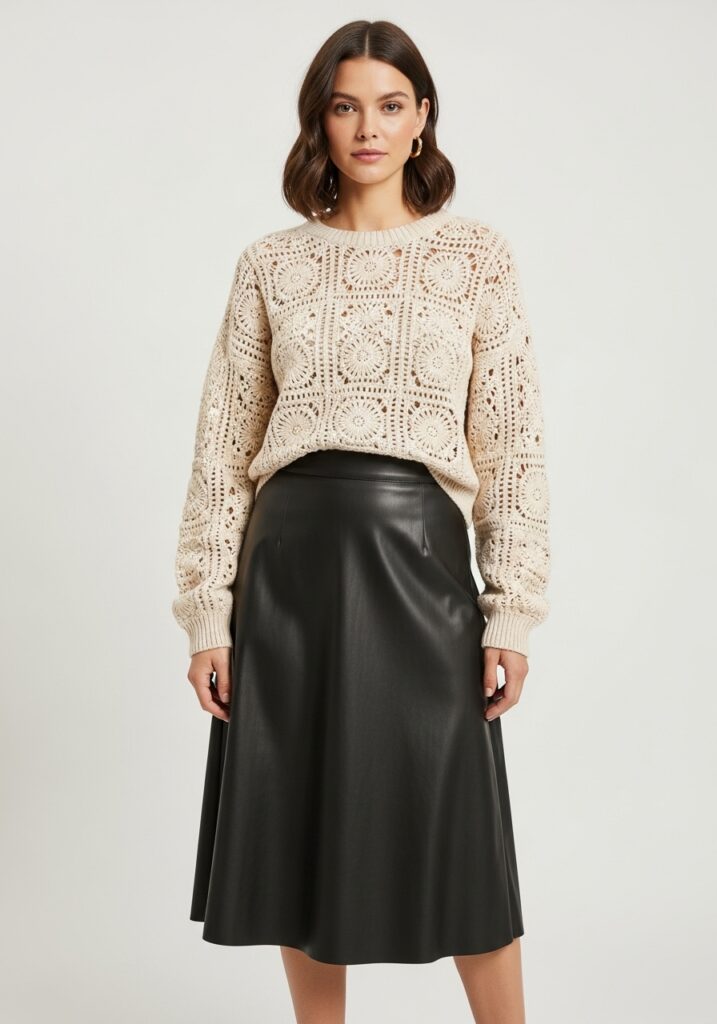 | Crochet Sweater + Leather Skirt | Crochet sweater | Slightly dressier occasions |