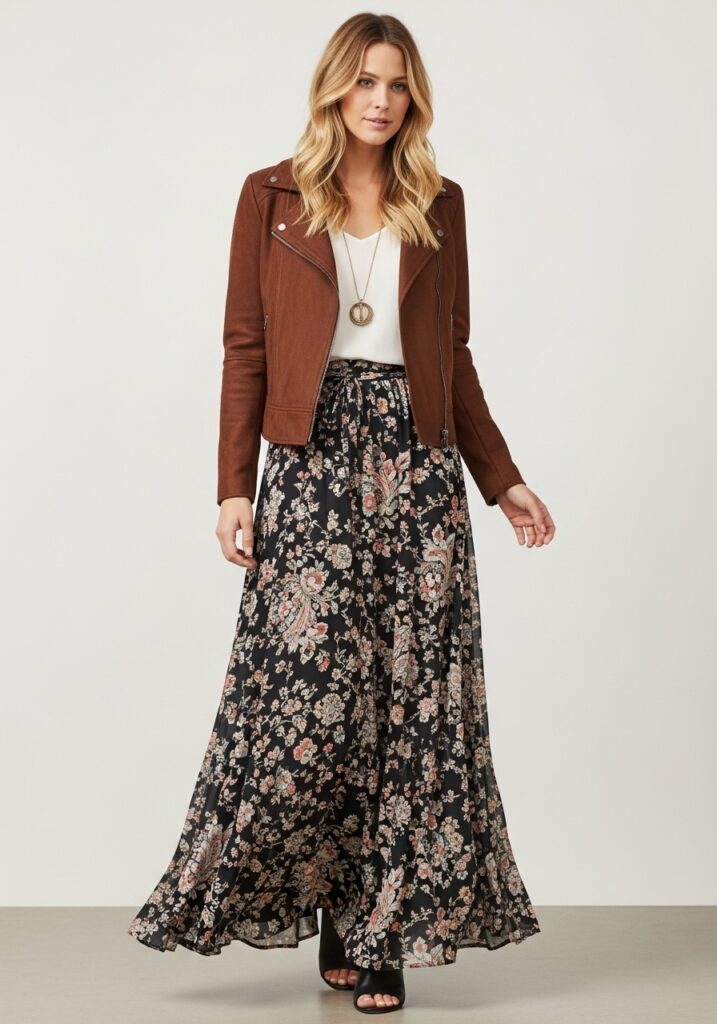 A suede or faux-suede jacket paired with a flowing maxi skirt offers a perfect fall boho vibe. The suede provides that rich texture that is trending this season, while the maxi skirt adds movement and softness. You might pair it with a top like the Amazon search “Women’s Faux Suede Jacket” (affiliate code hassansaleem-20) and layer over something like the “Selma Long Boho Maxi Skirt” (affiliate code hassansaleem-20) for that free-spirited look with just enough structure. This outfit bridges comfort and elegance, giving you warm layers while keeping things relaxed and effortless.