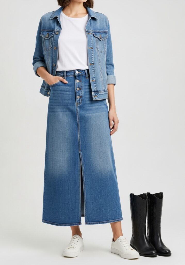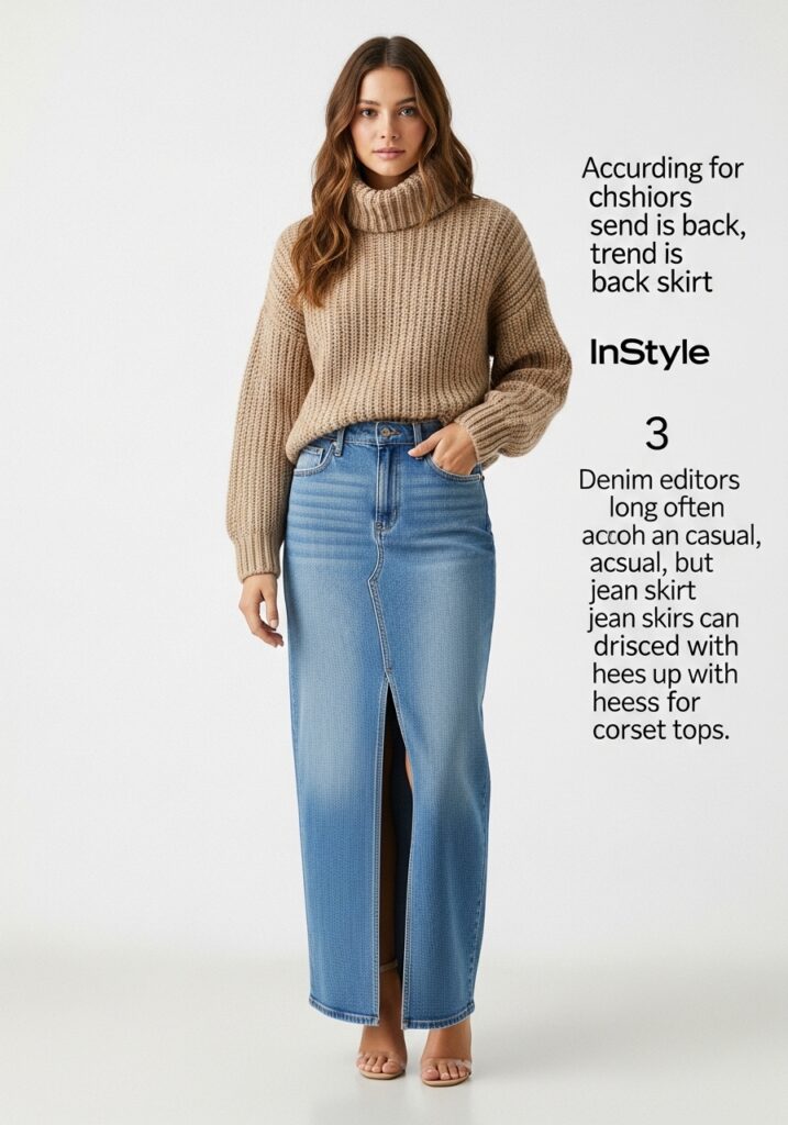 As the temperature drops, layering a cozy turtleneck or chunky knit over a long denim skirt with a front slit becomes a go-to. The slit adds movement and keeps the skirt from feeling too heavy. According to fashion editors, the long denim skirt trend is back and “denim often comes across as casual, but jean skirts can be dressed up with heels or corset tops.” InStyle This pairing balances warmth and style perfectly.