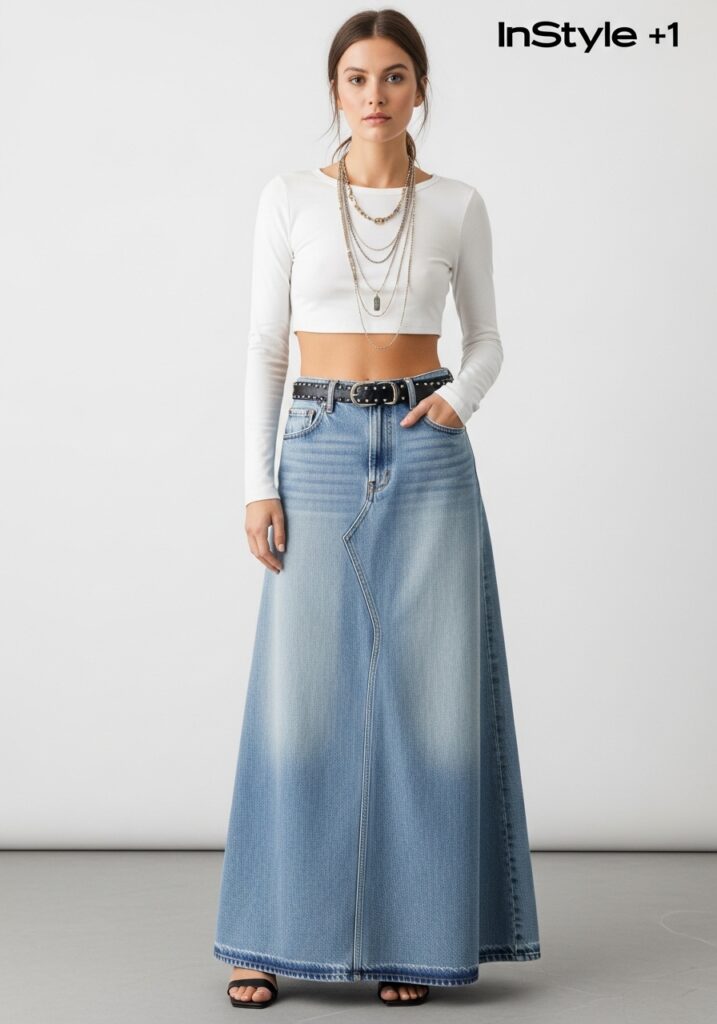 Want to lean into current trends? Pair a light wash denim long skirt with a fitted crop top for a 90s-inspired silhouette. The shorter top highlights your waist and allows the skirt to flow. Street style shows this revival in full effect. InStyle+1 Add layered necklaces or a belt for some extra detail.