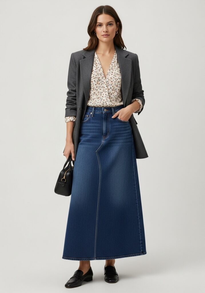 For a more refined take, pair a dark wash denim long skirt with a tailored blazer and a tucked-in blouse. The contrast between structure (the blazer) and the casual texture (the denim) gives you an elevated yet relaxed outfit. If you choose a skirt like Women’s Maxi Jean Skirt-High Waisted A-Line Long (affiliate link: Women’s Maxi Jean Skirt-High Waisted A-Line Long – hassansaleem-20), you’ll have a high-rise fit that accentuates the waist and pairs beautifully with loafers or low heels.